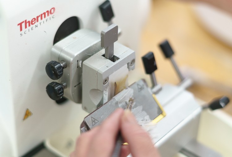 The block is now ready to be sectioned, this is like slicing thin layers of onions but instead we would be looking under a microscope slicing 10 µm layers. This is the stage that requires the most precision. Perfect sections are then placed on slides.