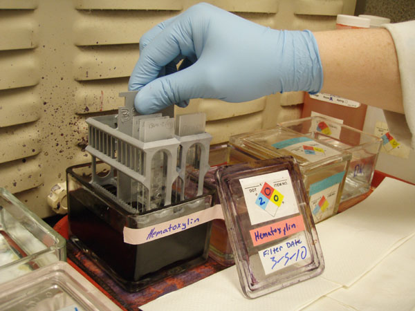 The whole process was fairly straight forward. During a patient’s surgery or autopsy a specimen is cut away from the problematic organ (in this case an ovarian tumor) and is stored within a sealed container along with a fixative called formalin, this preserves the tissue and prevents it from decaying during transport. This specimen always comes with a paper slip stating details such as: