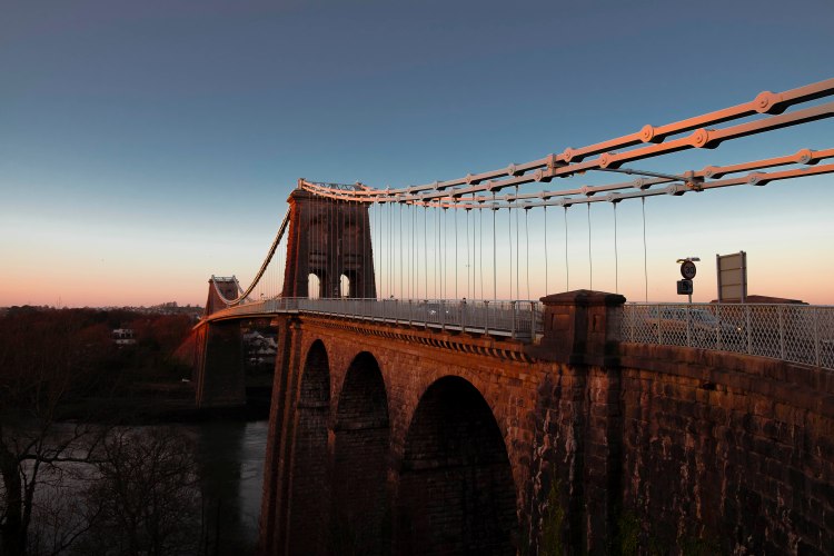 Snowdonia Mountain on the left and the Menai Suspension Bridge on the right